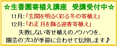 生香園オリジナル「寄植え講座」参加者募集中 11月:令和7年11月20日木曜 13時~15時 テーマ 「玄関を明るく彩る冬の寄植え」 12月:令和7年12月 4日木曜 13時~15時 テーマ:「お正月を飾る迎春寄植え」 … 続きを読む »生香園寄植え教室募集中